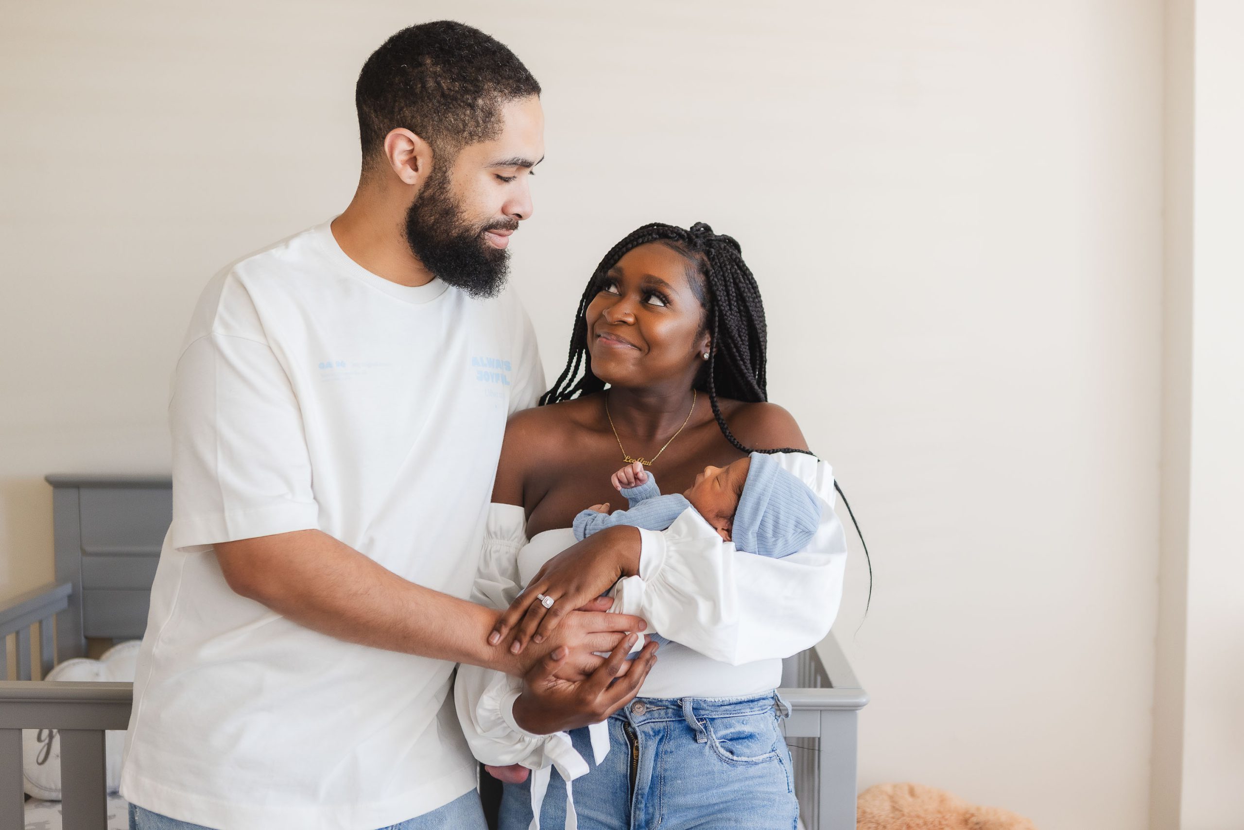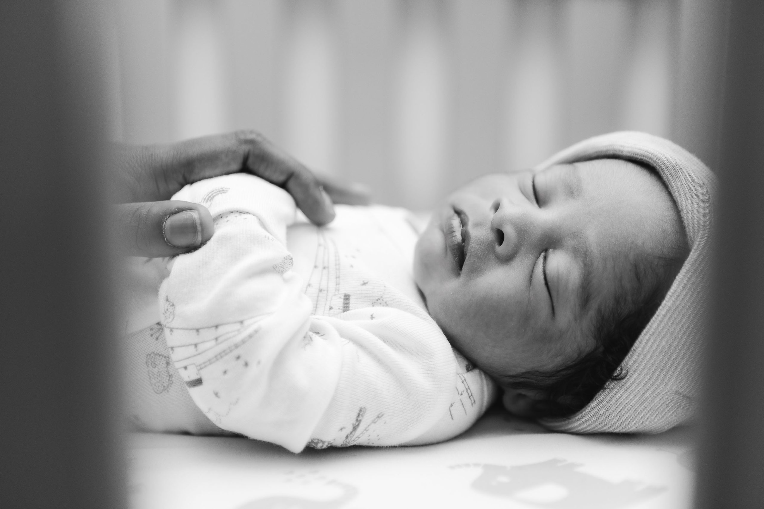 In the nursery, the ambiance shifted. Here, I photographed Lee-Ann in the chair where she nurses, capturing the a glimpse of her motherhood in its natural form. Joined later by the father, these images were an expression of family in a new phrase. We had hoped to include Lee-Ann’s elder daughter in the session. However, respecting her hesitance, we focused on the newborn to keep a comfortable and pressure-free environment. In the crib, the baby was particularly at ease. I managed one serene shot with his eyes open, followed by another impactful black and white photo viewed through the crib’s slats.
