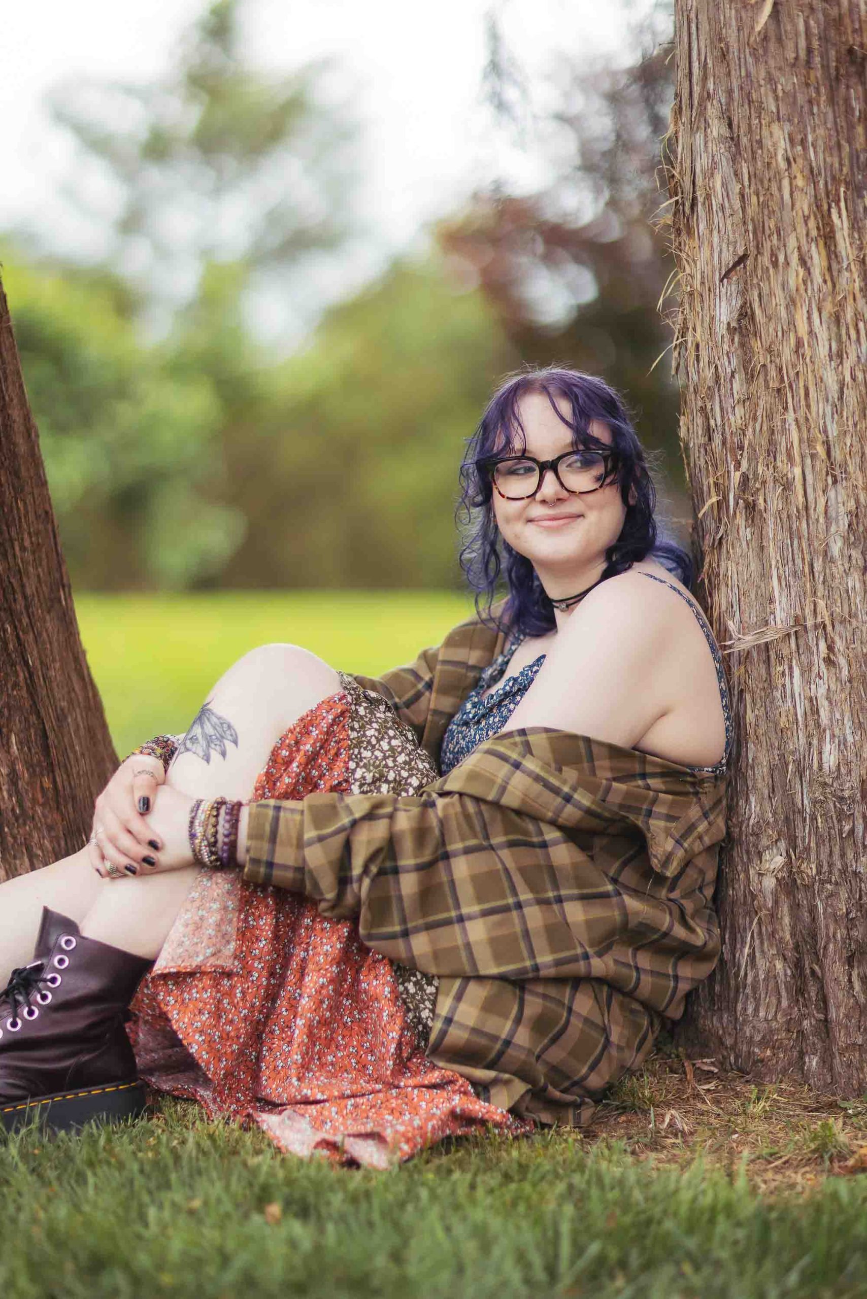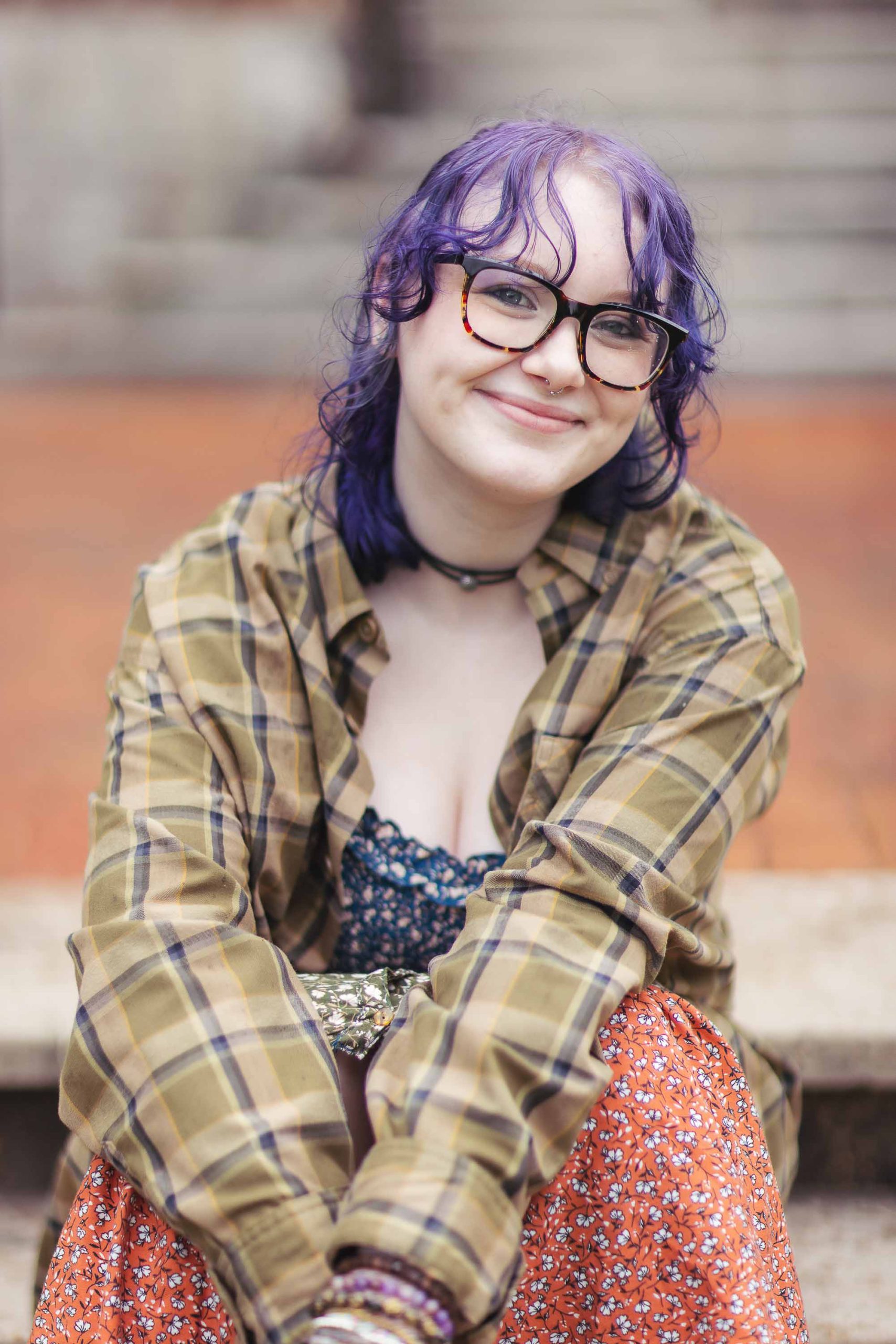 The weather, a cloudy sky with intermittent rain, set a mood that was unexpectedly perfect for the day. The choice of Bel Air Mansion was practical for this express session, but it was Olivia’s unique style that really set the tone. Her look, a blend of punk rock and grunge from the 80s and 90s, brought a vivid splash of personality to the setting. Dark purple hair, signature thick glasses, and a casually worn flannel shirt made every frame distinctly hers.