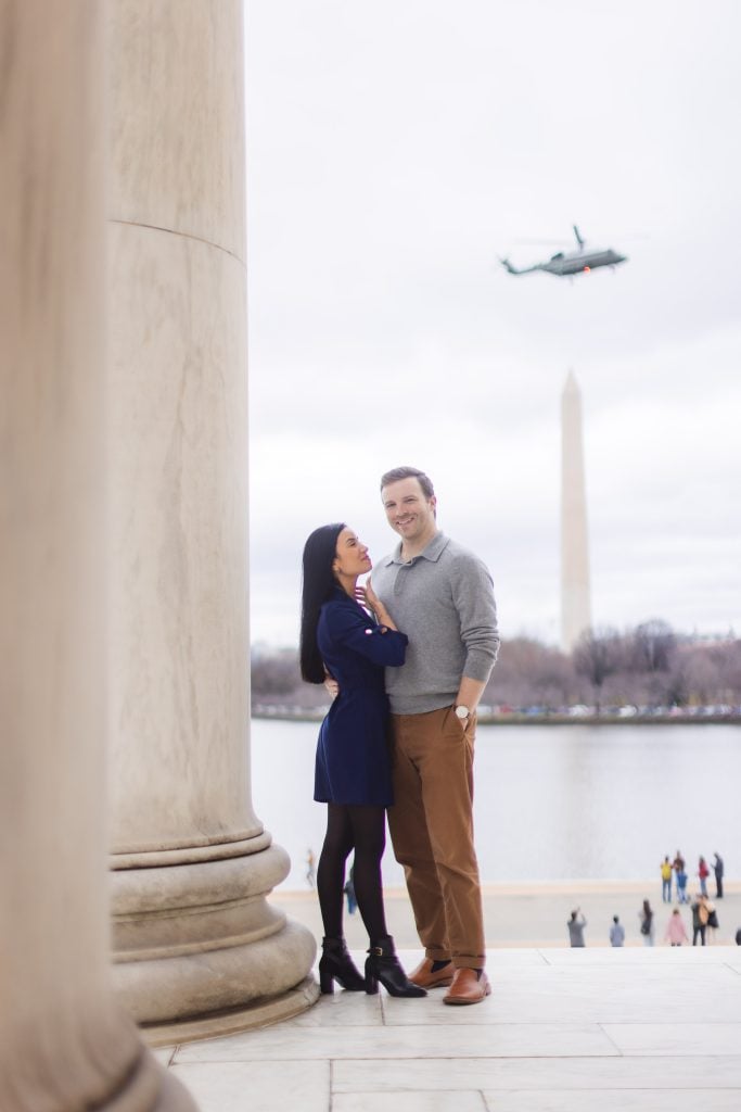 To avoid drawing the ire of a park ranger who otherwise really couldn’t care less that we were there, we stayed strictly on the outside of the monument, which was fine anyway because a very big group of tourists was consuming much of the interior. I took a moment to organize a photo of the whole family walking casually away from the monument, which really turned out nicely. After one more prestige-drama style group photo in one of the stony alcoves to the side of the building, we split off and started doing some photos of individuals and couples on their own. In the process, we caught one lucky shot overlooking the Tidal Basin of Zach and his wife with Marine Force One flying overhead.
