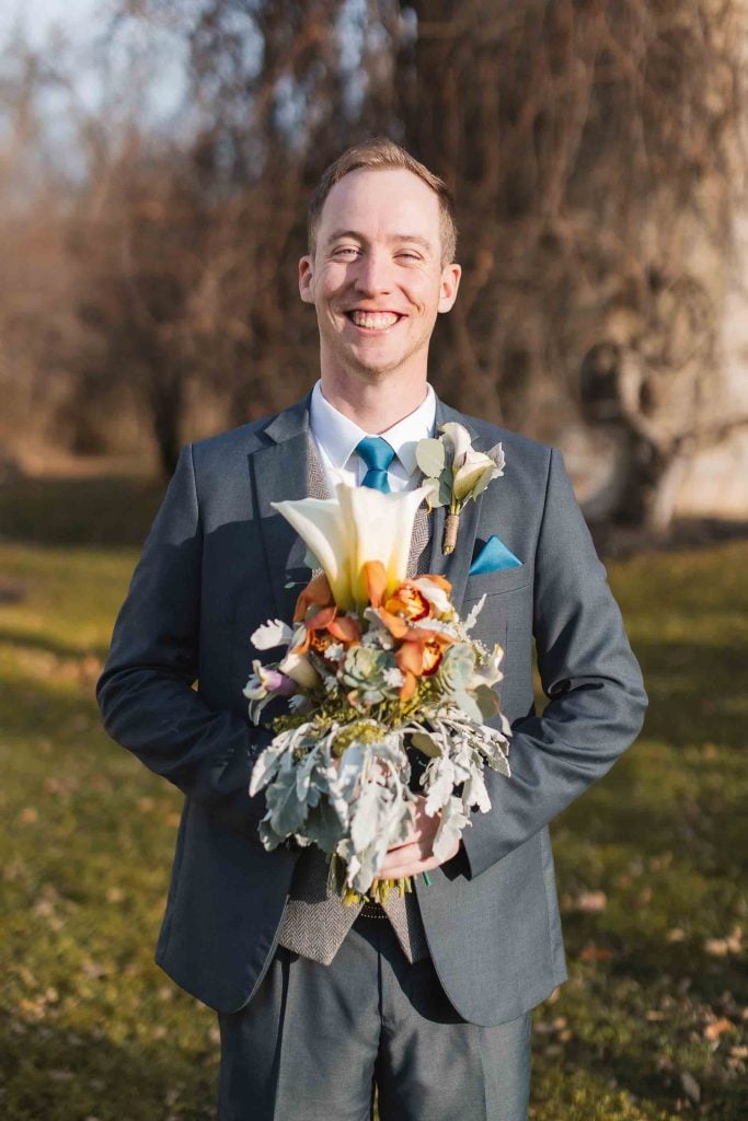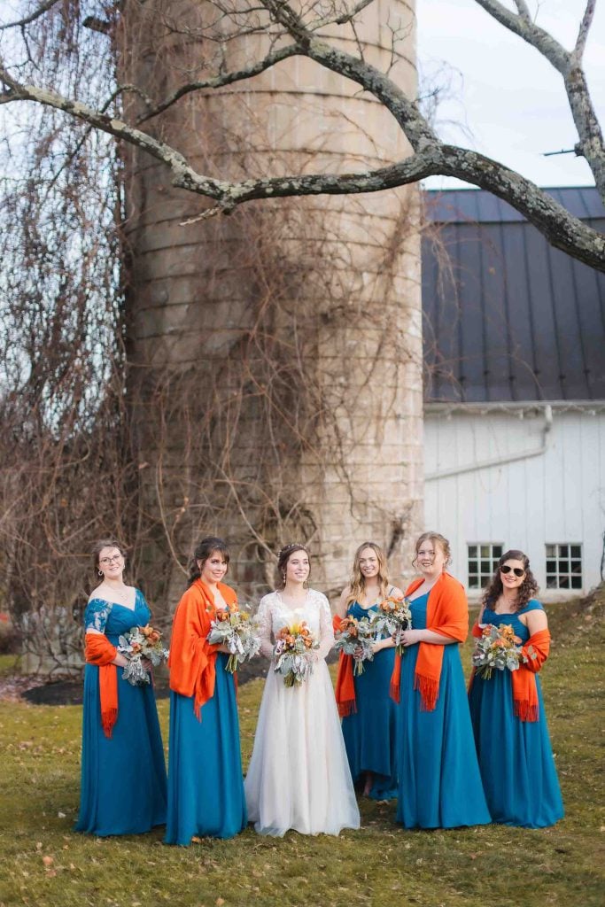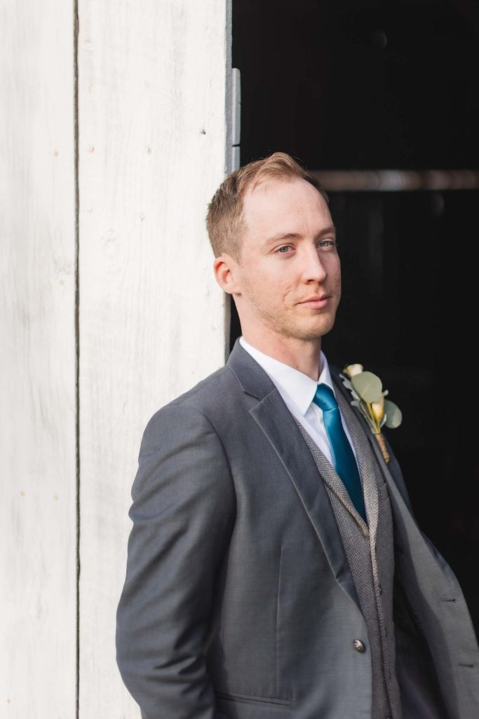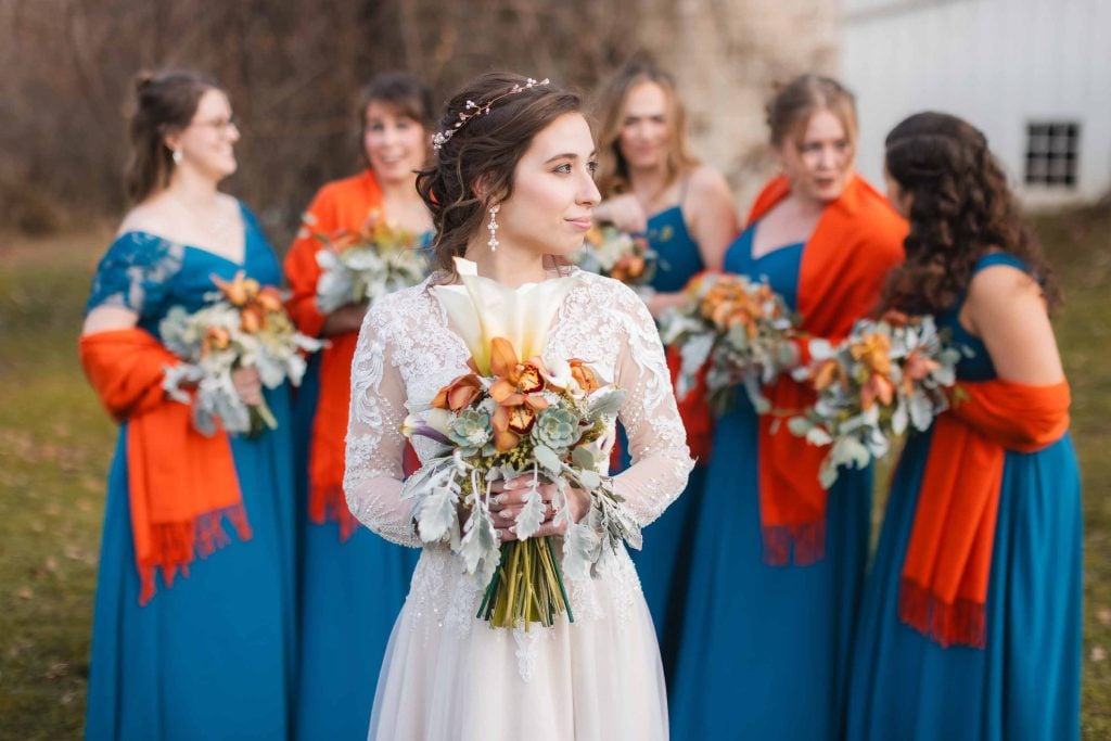 From there, we moved closer to the tasting room for some shots with Ralen’s party facing the farm house, and Keely’s party facing the silo. When the light landed just right and a shot would catch my eye, we’d capture a shot of Keely or Ralen on their own or together. These fleeting in-between shots really highlighted Poetically Brushed’s gorgeous work with the hair and makeup. We also took the opportunity in the middle of the portraits for a shot of Abigail’s Flowers‘ stunning floral arrangement, as well as Keely’s rhinestone emblazoned boots.